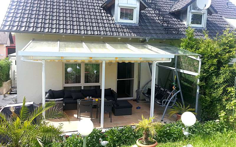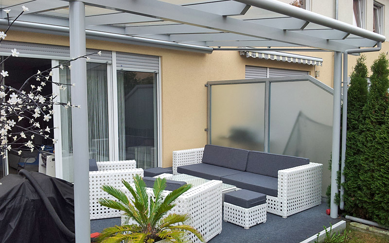 Auf Wunsch fertigen wir Ihre Terrassenüberdachung mit VSG-Verglasung und überlassen Ihnen mit frei wählbarer RAL-Farbausführung kreativen Handlungsspielraum.